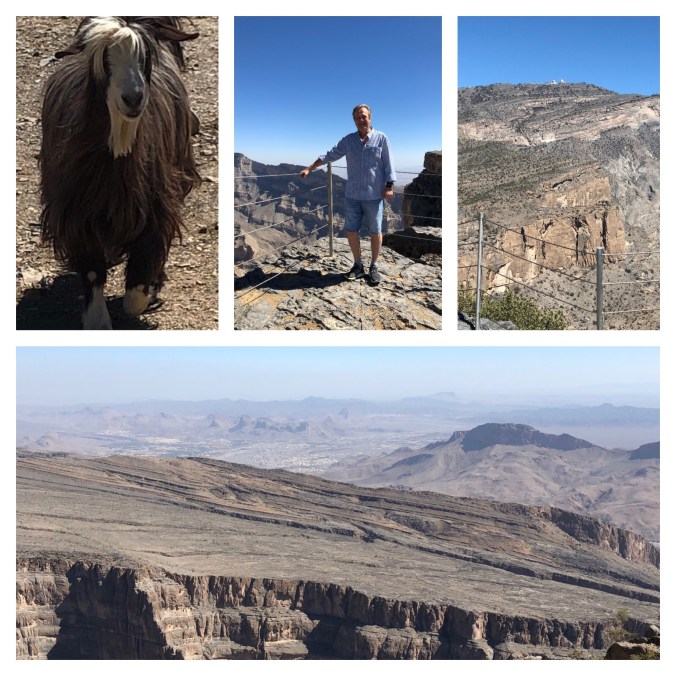 Etter Nizwa bar det avsted oppover……oppover…., og oppover. Nesten helt til topps på Midt-Østens høyeste fjell, Jabal Shams i Hajarfjellene. Vi var nesten til topps, selve toppen på vel 3000m er opptatt med installasjoner til Flyvåpnet, men vi var på over 2500m, og det holdt i lange baner. Er utsikt hinsides noe vi har sett tidligere, og en «canyon» som tok pusten fra oss. Her oppe på 2500m inntok vi en fortreffelig lunsjboks som var laget til oss på forhånd.